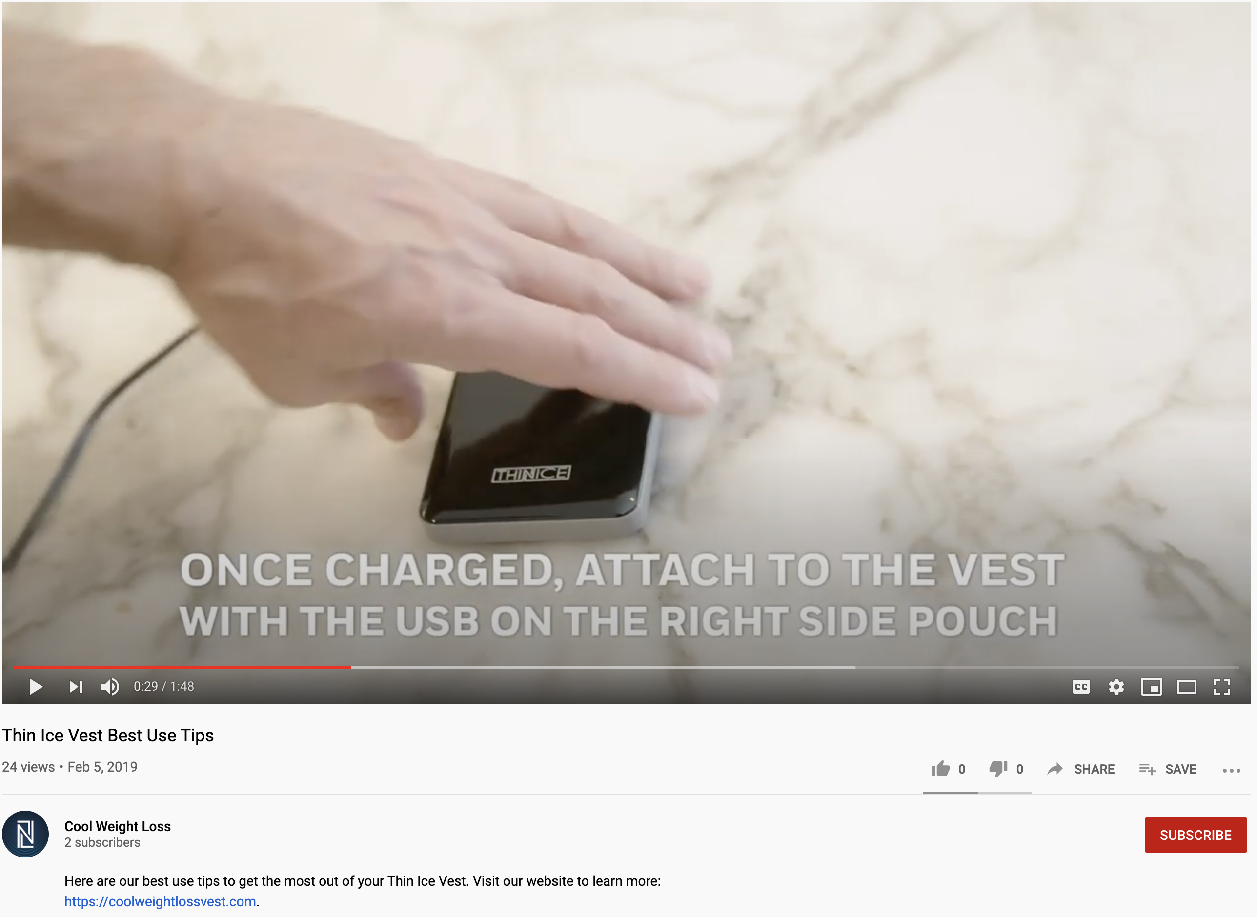 How can we tell that coolweightloss vest is the same as the Thin Ice weight loss vest? Well, for one, it has the same rickety ventilator on the back. The placement making it impossible to use the vest while leaning back. So no losing weight while sitting on the couch watching Netflix and snacking on pizza. The configuration of the vest also means you can not wear it under your clothing. This used to be one of the main selling points for the Thin Ice Vest that was advertised as a thin layer vest cooling you down unobtrusively while working and going about your regular life. This ventilator will not work underneath a layer of clothing. A second proof of coolweightloss and ThinIce being one and the same is even more convincing. It says so on their Youtube video page!